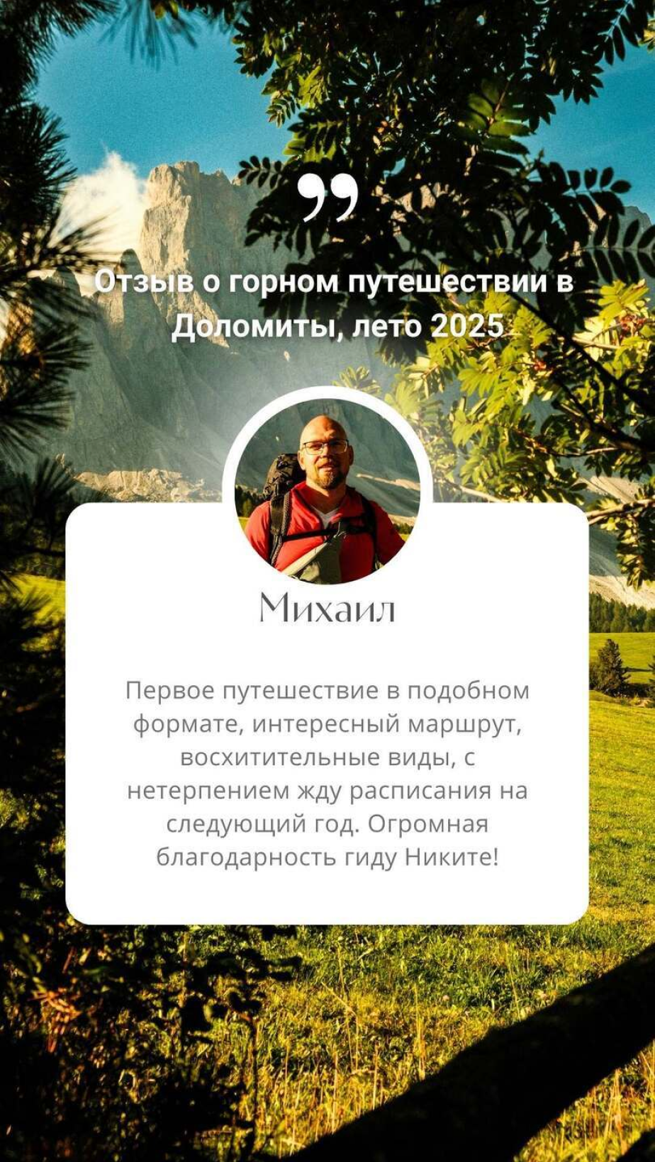 Я внимательно отношусь к каждому участнику приключения, поэтому собираю небольшие группы. Помогаю выбрать снаряжение, контролирую здоровье на треке, поддерживаю дружескую, легкую атмосферу и хочу видеть на треке людей с общими ценностями - бережное отношения к природе и гармонии со своим внутренним Я, через эту самую природу. Отравляйся в треккинг по Доломитам с моим клубом путешествий Nikita Travel, ты не пожалеешь.